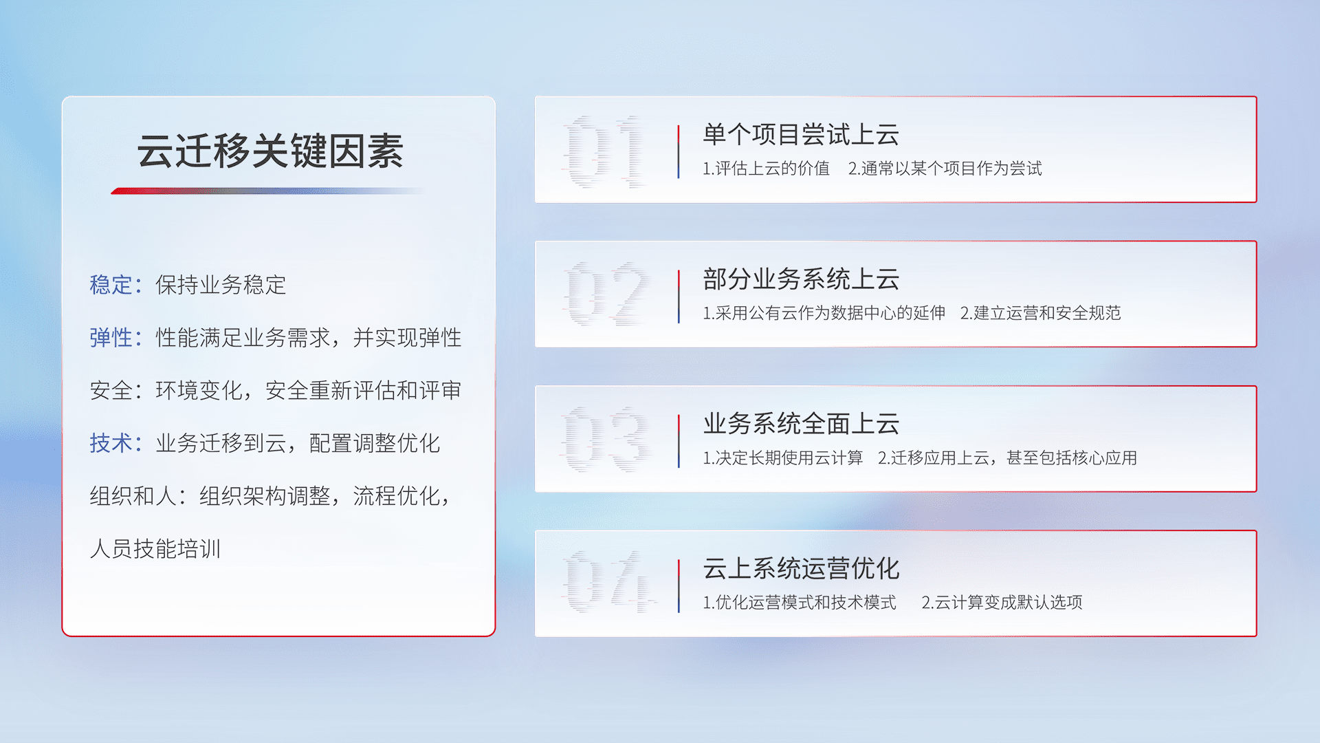 结合实际业务,,,,从规划设计、、、云平台选型、、云原生改造、、数据迁移、、集成交付,,迁移全过程为客户识别最佳上云路径,,做好风险识别管理,,,,设计网络架构、、、、身份权限、、安全审计合规、、、、操作审计、、、、日志审计、、、监控告警策略、、、、多站点容灾设计等,,对云上基础设施进行整体规划,,,提升IT治理水平,,,以满足弹性、、、高可用、、、、高性能的需求。。。。